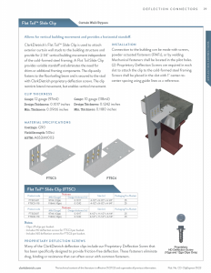 ClarkDietrich Flat Tail™ Slide Clip is used to attach exterior curtain-wall studs to the building structure and provide for 2-1/4" vertical building movement independent of the cold-formed steel framing. A Flat Tail Slide Clip provides variable standoff and eliminates the need for shims or additional framing components.